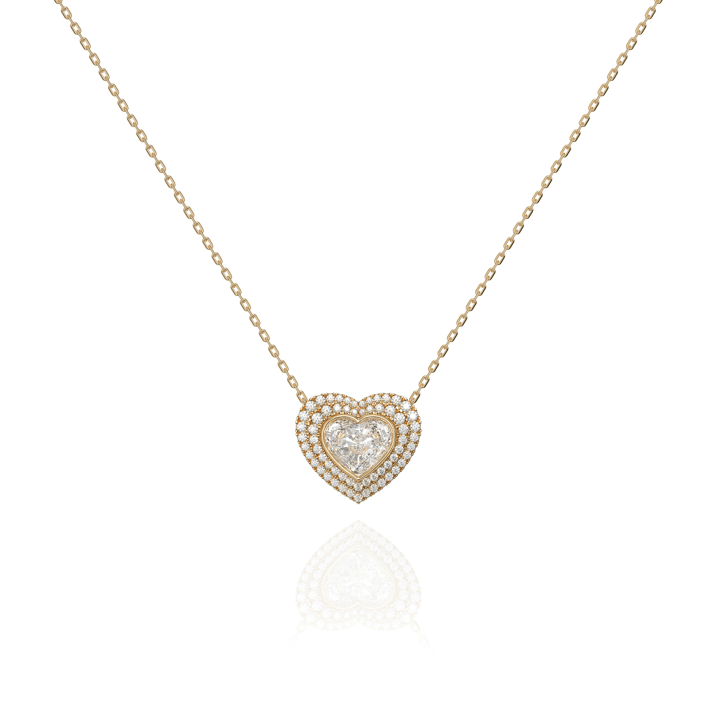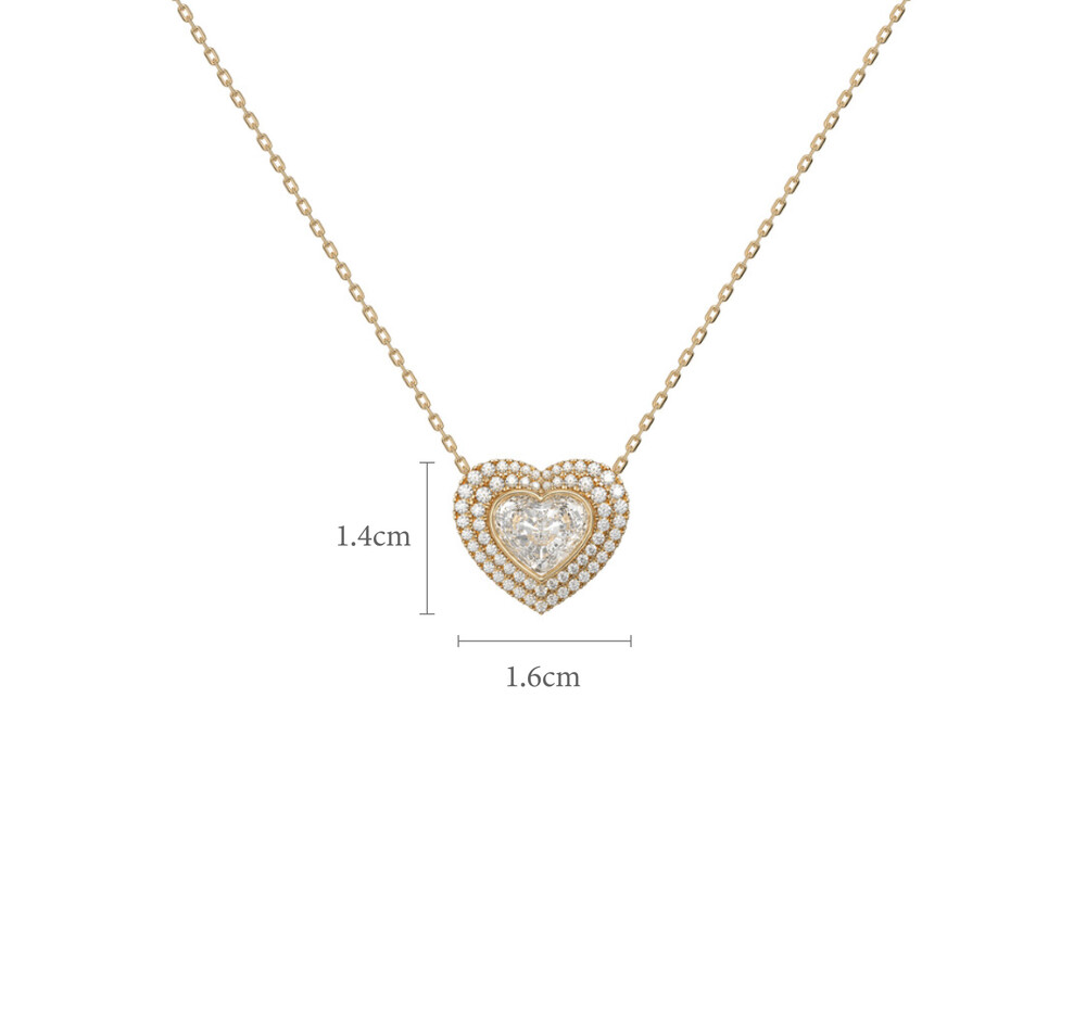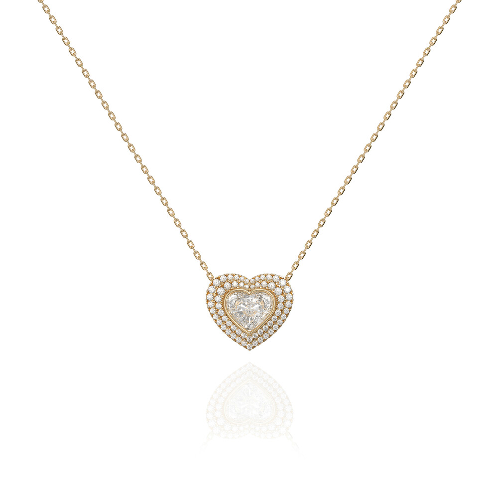 Amber의 Heart Double Halo Necklace는 2캐럿 하트컷 스톤이 가진 단정하고 고요한 아름다움을 두 겹의 헤일로로 감싸 마치 숨결처럼 반짝이는 입체적 광채를 완성한 하이주얼리 피스입니다.